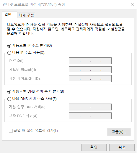 이렇게만 하면 간단하게 윈도우10에서 고정IP 설정 및 해제가 완료됩니다.